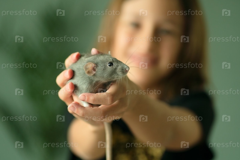 Молодая девушка осторожно держит пыльную серую крысу Дамбо в своих сжатых руках. Домашнее животное сидит спокойно. Размытая фигура другого ребенка позади. Радость владения домашним животным и привязанность