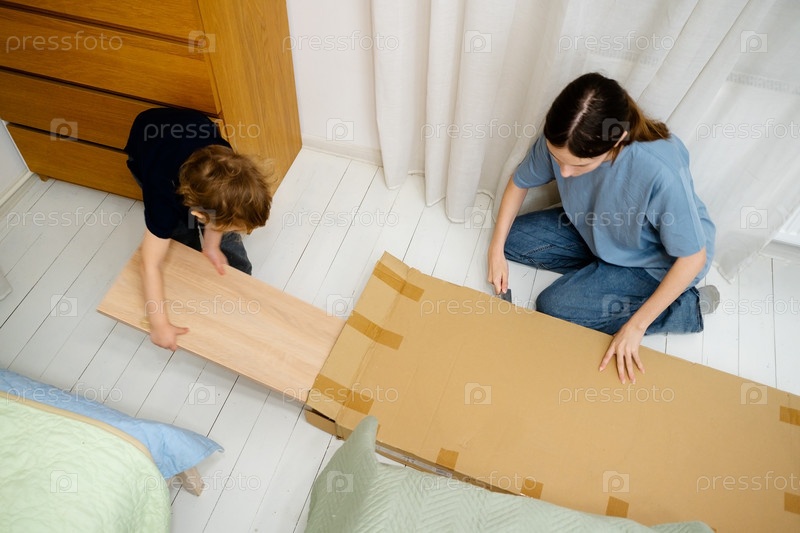 Дети, вынимающие детали гардероба из коробки доставки