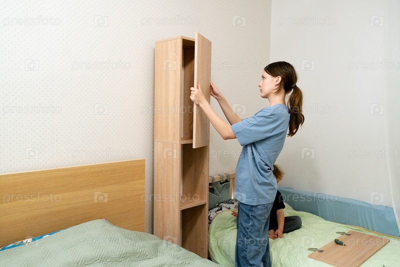 Молодая женщина прикрепляет двери к собранному гардеробу