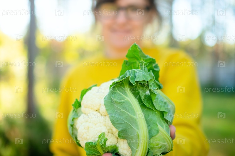 Закройте руки женщины-фермера, держащей голову цветной капусты в осенний сезон сбора урожая. Органические овощи, здоровая пища, натуральное сельское хозяйство и богатая клетчаткой диета, местные продукты, выращенные с осторожностью