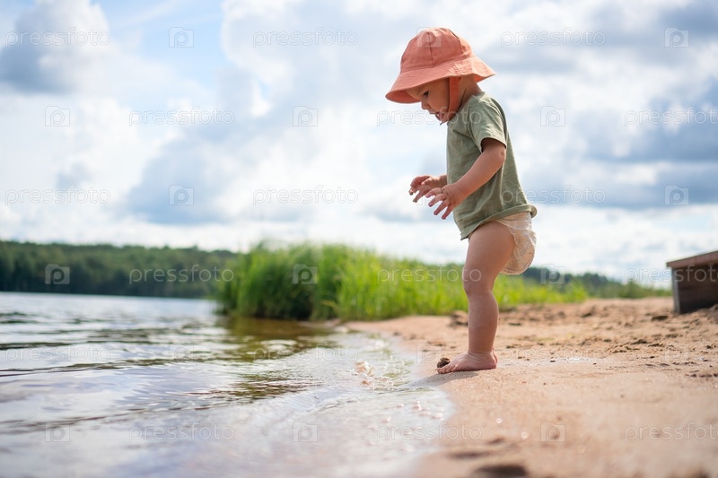 Малыш идет по берегу с оранжевой шляпой, ощущая песок и воду под ногами