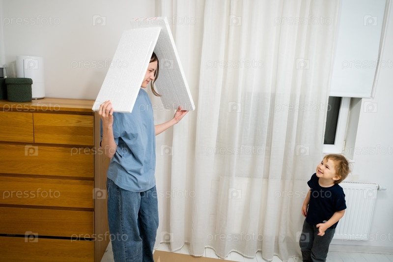 Сестра и ее младший брат с радостью используют компоненты несобранного книжного шкафа, чтобы построить воображаемый игровой дом. Они наслаждаются игровым временем вместе