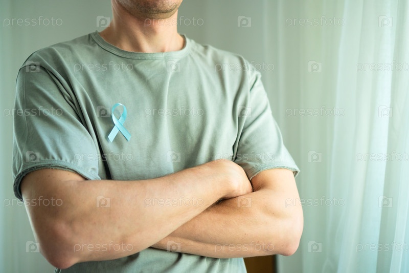 Закрыть молодого человека с синей атласной лентой, прикрепленной к его рубашке. Концепция ноябрьской осведомленности о раке предстательной железы, раннего выявления, медицинской диагностики и лечения онкологии