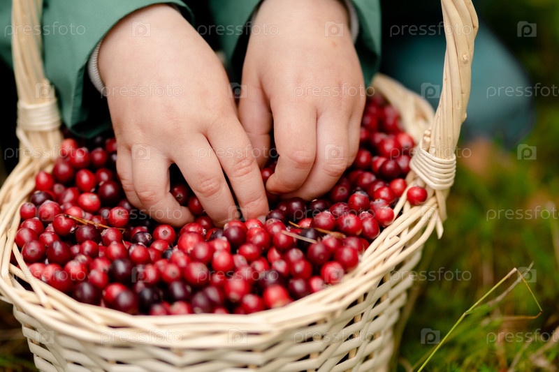 Руки малыша с корзиной клюквы осенний природный фон