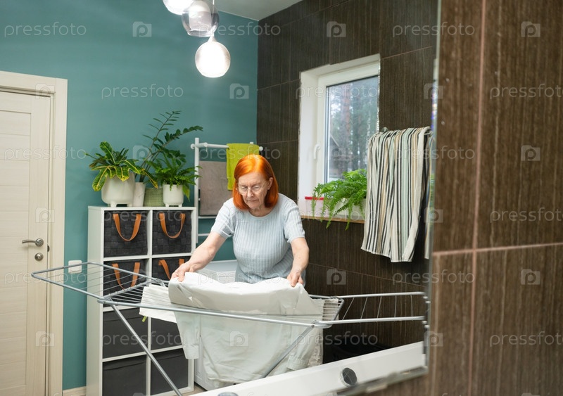 Пожилая женщина сглаживает морщины на стойке высушенного белья