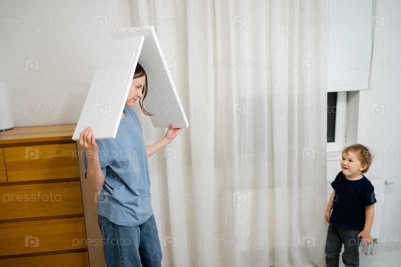 Девочка-подросток и ее младший брат веселятся, используя деревянные доски и части плоского шкафа, чтобы притвориться, что строят игровой дом. Они смеются и играют