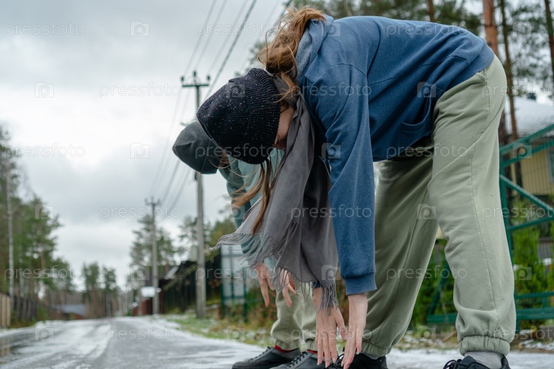 Два подростка занимаются глубоким передним изгибом растяжек после завершения пробежки. Это упражнение нацелено на подколы, спину и способствует общей гибкости в рамках важной рутины охлаждения