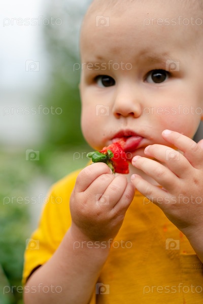 Маленький ребенок ест клубнику самостоятельно на открытом воздухе