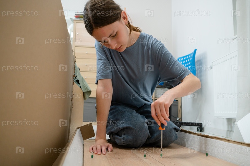 Молодая женщина с помощью отвертки собирает гардероб