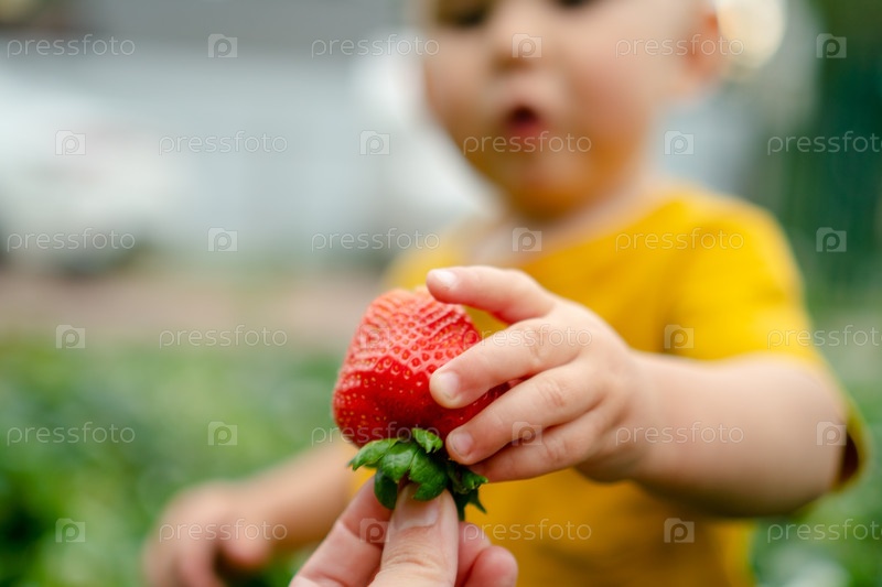 Сосредоточьтесь на клубнике, как удивленный ребенок хватает ее