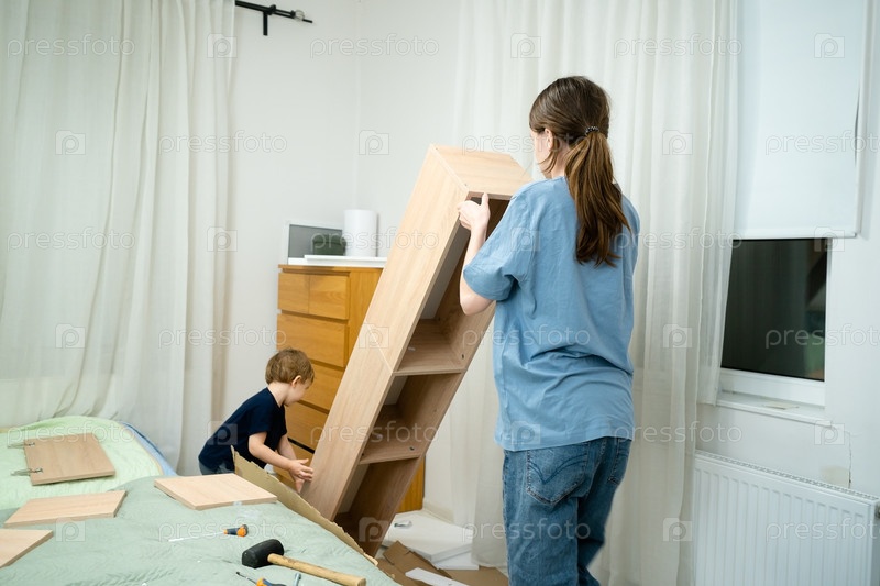 Молодой мальчик охотно помогает своей старшей сестре подняться и найти подходящее место для шкафа, который они только что закончили собирать