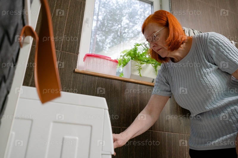 Старшая леди активирует стиральную машину снизу