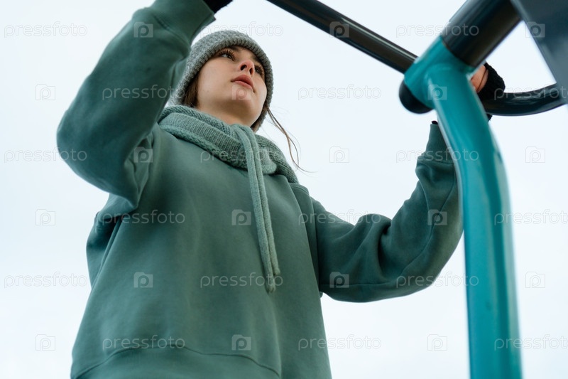 Динамический выстрел под низким углом, глядя на молодую женщину, тренирующуюся на открытой спортивной станции. Перспектива подчеркивает структуру оборудования, его мощную позу и зимнее небо на заднем плане