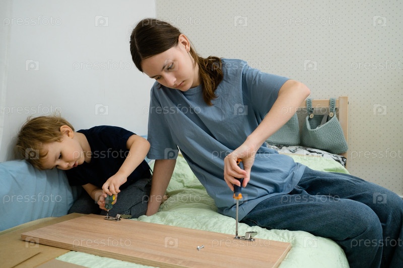 Маленький брат копирует свою старшую сестру, используя отвертку для сборки частей гардероба, следуя ее примеру и обучаясь через подражание