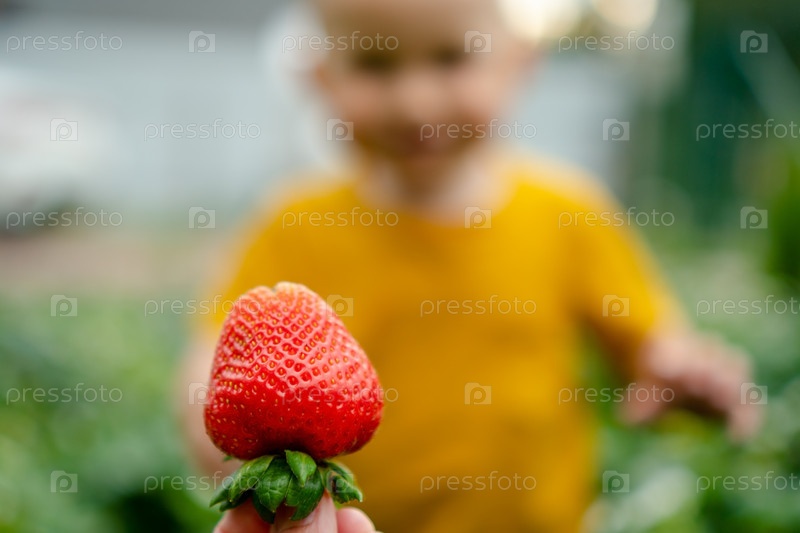 Мама подарила клубнику счастливому размытому малышу