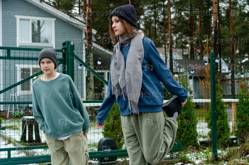 Два подростка занимаются глубокими упражнениями на растяжку мышц ног после бега. Эта деятельность способствует удлинению мышц, помогает восстановлению и дисциплинированному фитнесу