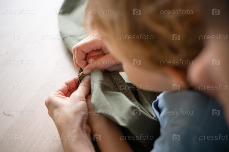 Заботливая мать, портниха, держащая своего ребенка во время ремонта брюк, отбирая шов. Сверху вниз, домашнее шитье, семейная жизнь