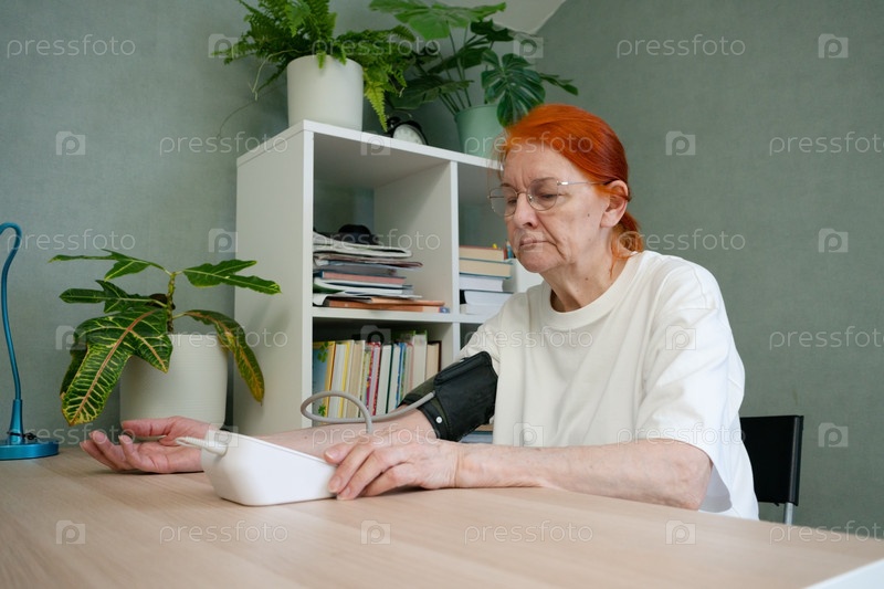 Побочный взгляд на пожилую женщину с грустным, обеспокоенным выражением, когда она проверяет свое кровяное давление. Сосредоточьтесь на профиле и заботе о здоровье