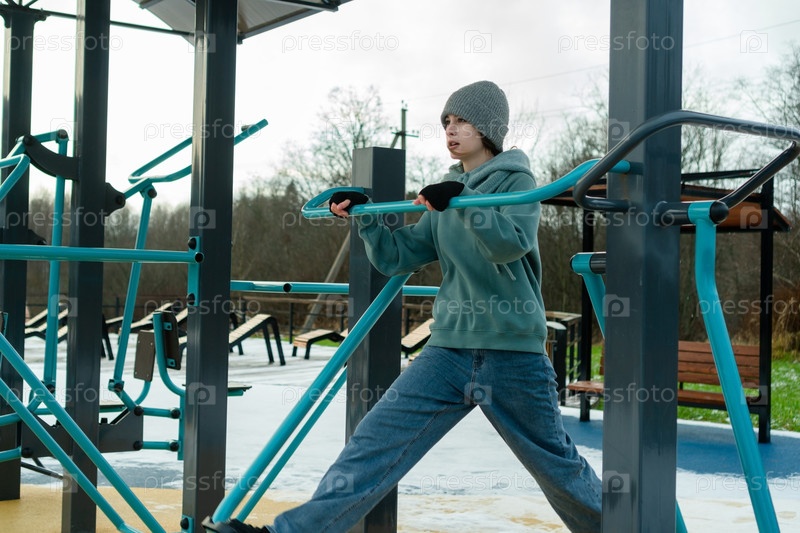 Молодая женщина работает на наружной пресс-машине для ног, вид со стороны. Она фокусируется на толкании платформы ногами, занимаясь силовыми тренировками во время зимней фитнес-сессии