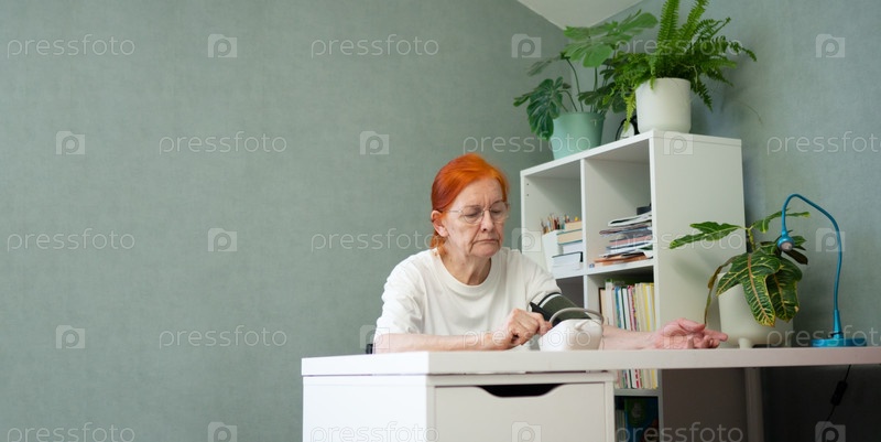 Пожилая женщина сидит за столом в своей домашней обстановке на этом горизонтальном баннере. Копировать пространство с левой стороны, подходящее для текста о мониторинге здоровья, пожилом образе жизни или медицинской помощи