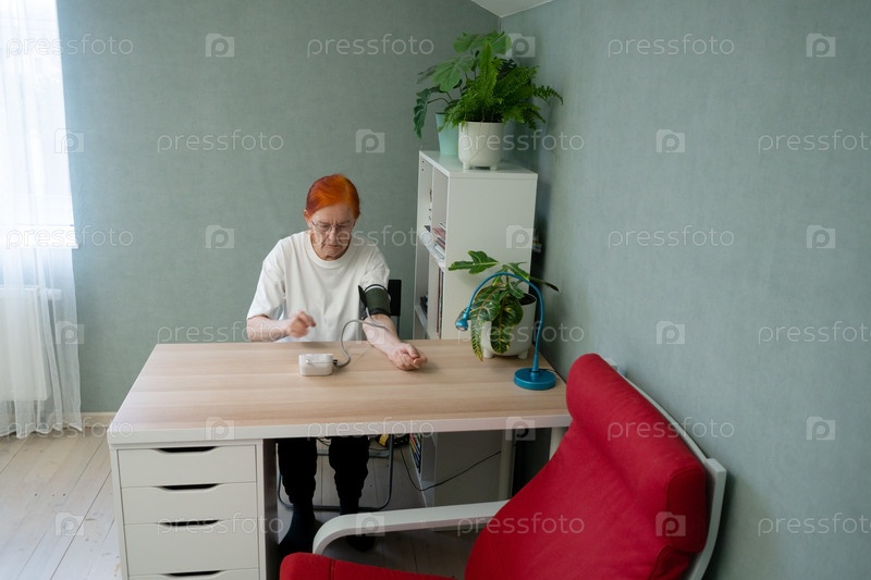 Пожилая женщина проверяет свое кровяное давление с помощью цифрового монитора, сидя за столом, снятым в отдаленном лобном виде