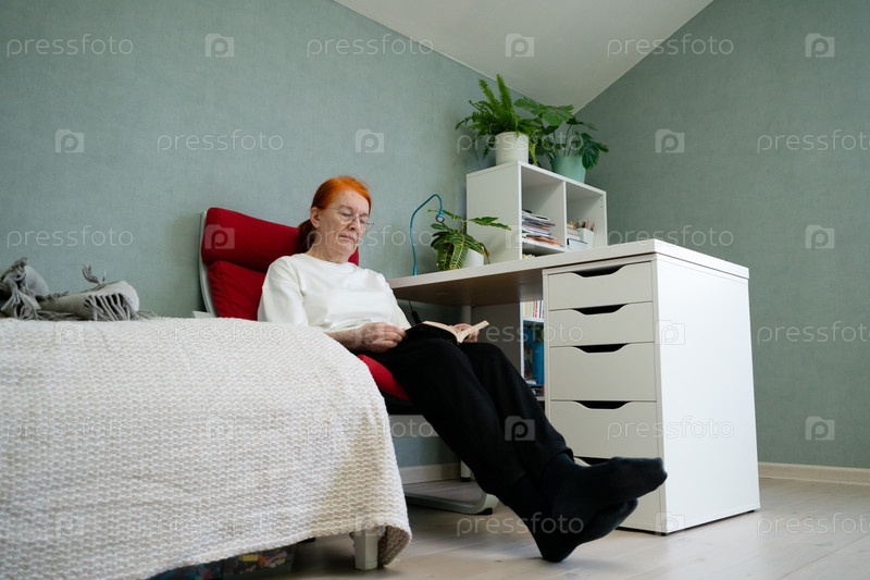 Низкий угол зрения старшей женщины, читающей в кресле