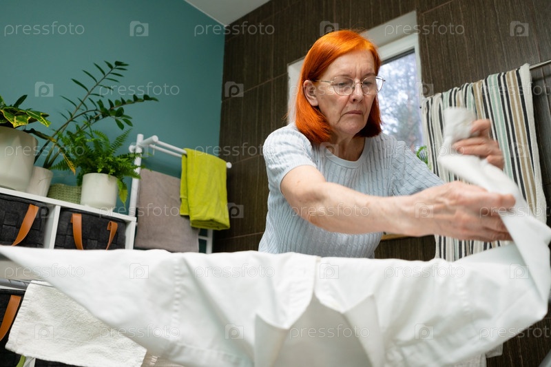 Зрелая женщина выкладывает рубашку на сушильную стойку без морщин