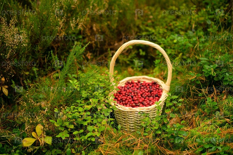 Осенняя лесная корзина, наполненная спелой клюквой