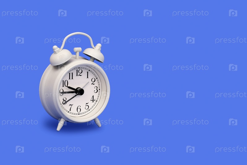 Белый будильник в старом стиле изолирован на синем фоне