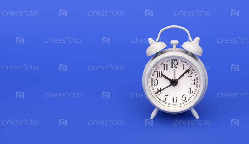 Белый будильник в старом стиле изолирован на синем фоне