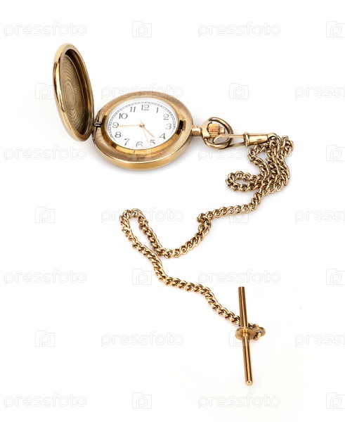 Золотой карман с цепными часами, изолированными на белом фоне