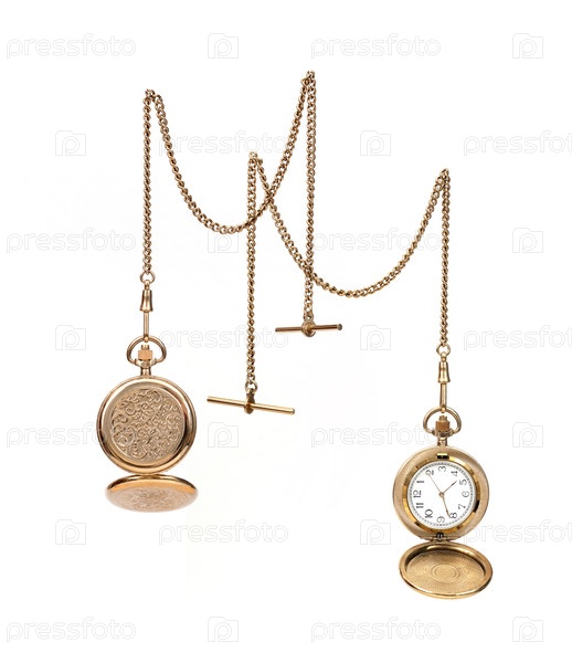 Золотой карман с цепными часами, изолированными на белом фоне
