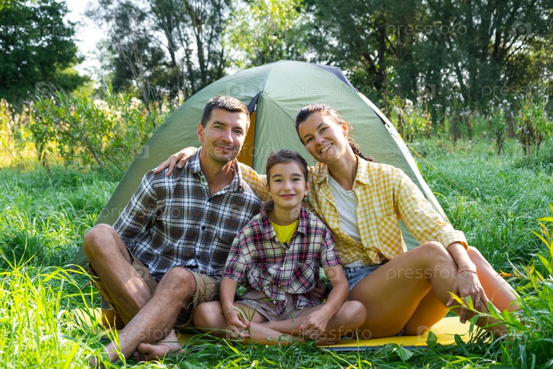 Портрет счастливой семьи, сидящей утром возле палатки для кемпинга на открытом воздухе, кемпинг, семейная походная поездка