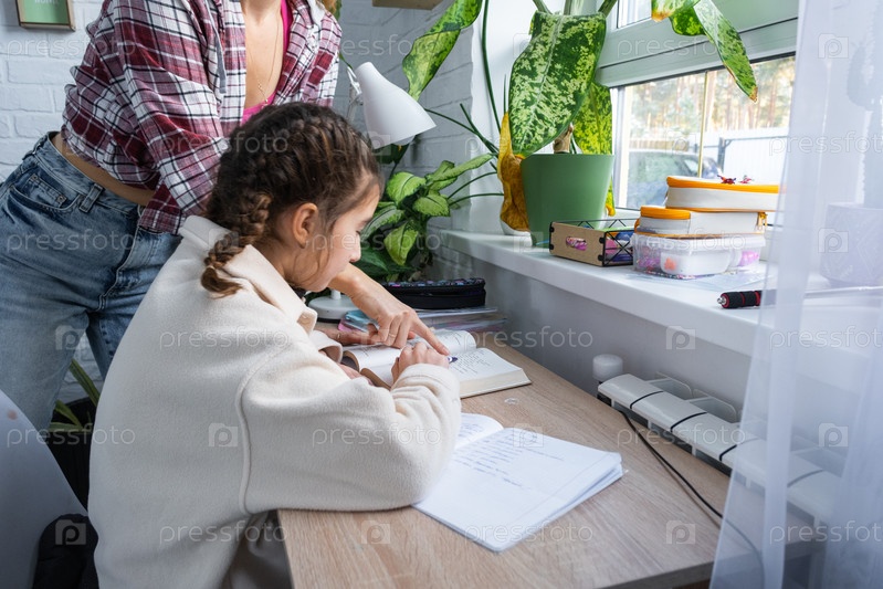 Мама помогает и проверяет домашнее задание школьницы для школы за столом