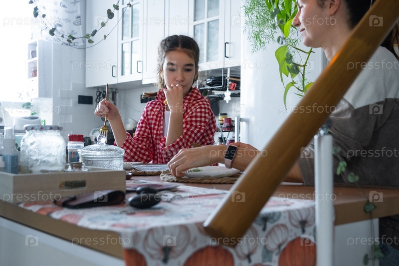 Девушка завтракает на кухне утром за столом в компании матери, утренние приготовления