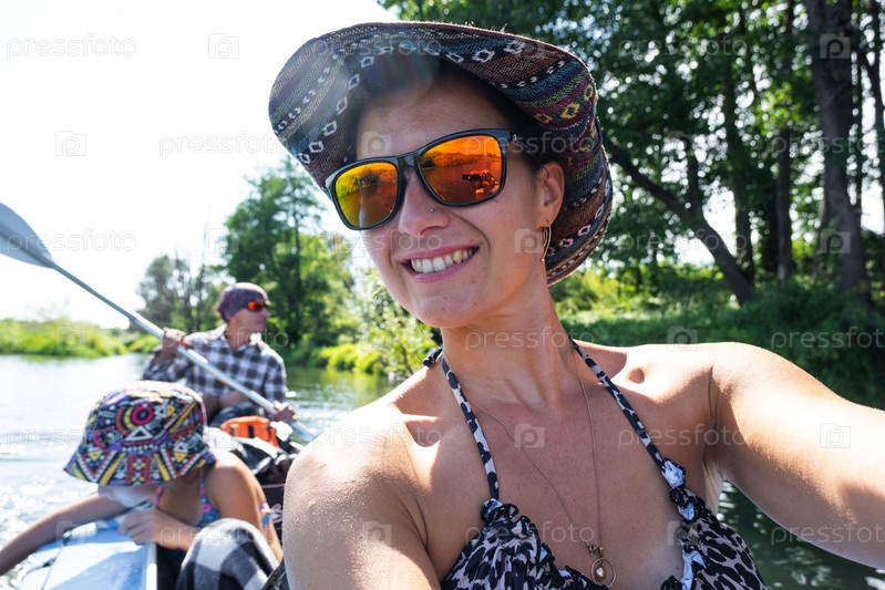 Мужская и женская пара, ребенок 8 лет, селфи счастливы в семейном путешествии на байдарках на лодке по реке, походе по воде, летнем приключении. Экологичный и экстремальный туризм, активный и здоровый образ жизни