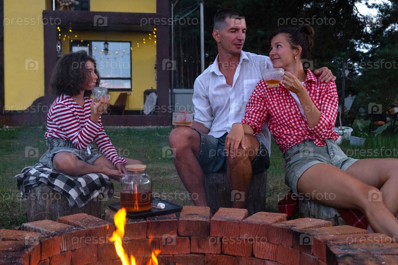 Семья мамы, папы, дочери пьют чай во дворе дома у пожарной ямы уютным летним вечером