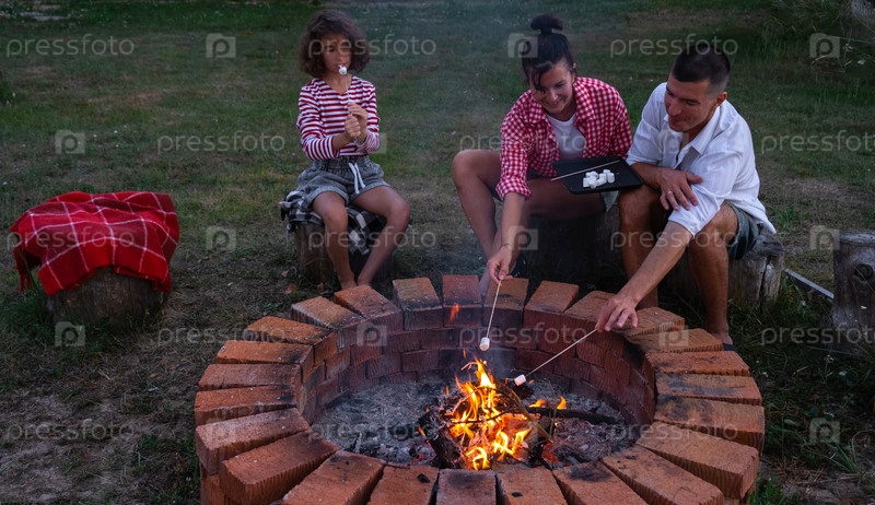 Семья мама, папа, дочь жарят зефир на шашлыках на костре в очаге во дворе дома у пожарной ямы уютным летним вечером