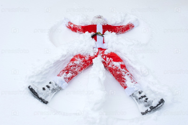 Санта-Клаус делает снежных ангелов в снегу. Юмор, зимнее веселье, Санта устал и пьян