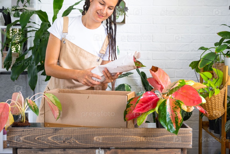 Женщина распаковывает коробку с посылкой горшечных цветов красного аглаонема - заказ завернутых тропических растений, доставка. Продажа, безопасная отправка растений из магазина, упаковка. Цветочный магазин, домашний бизнес