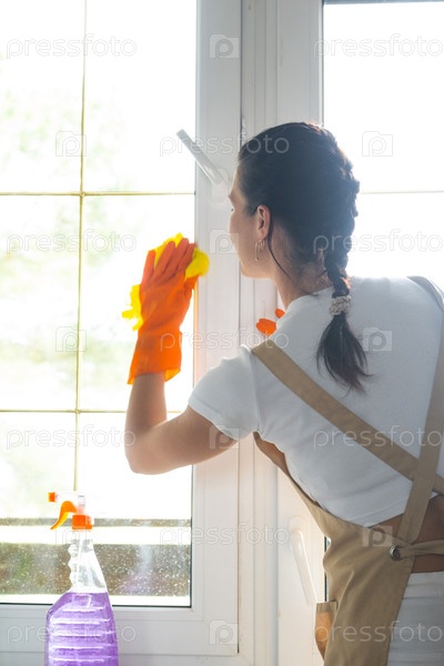 Женщина в резиновых перчатках и фартуке вручную моет оконный балкон дома тряпкой и шваброй внутри интерьера. Восстановление порядка и чистоты весной, уборка сервиза
