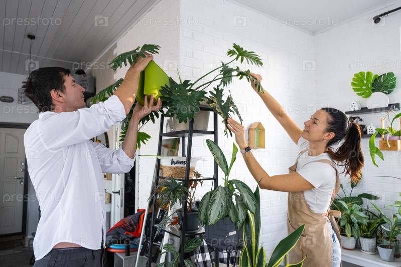 Мужчина и женщина ухаживают за домашними горшечными растениями на полках, поливая из поливной банки, услуги по уходу за домашними растениями