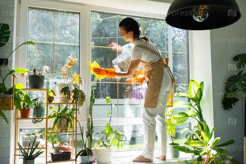 Женщина в резиновых перчатках и фартуке вручную моет окно дома тряпкой и шваброй внутри интерьера с домашними растениями на подоконнике. Восстановление порядка и чистоты весной, уборка сервиза