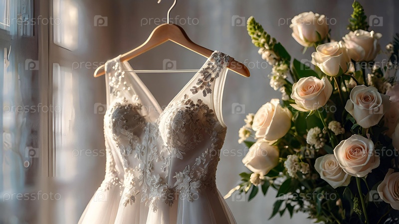 Близко. Элегантное белое свадебное платье на вешалке и букет цветов. Утро невесты. Аренда и покупка свадебных платьев для проведения мероприятий