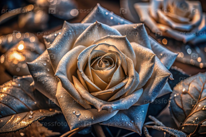 Кремовая роза красивого цвета кофе или цвета шампанского, покрытая росой на рассвете. Прекрасный солнечный свет. Фоновое изображение выполнено в зеленых и бежевых тонах. Естественный, экологически чистый природный фон