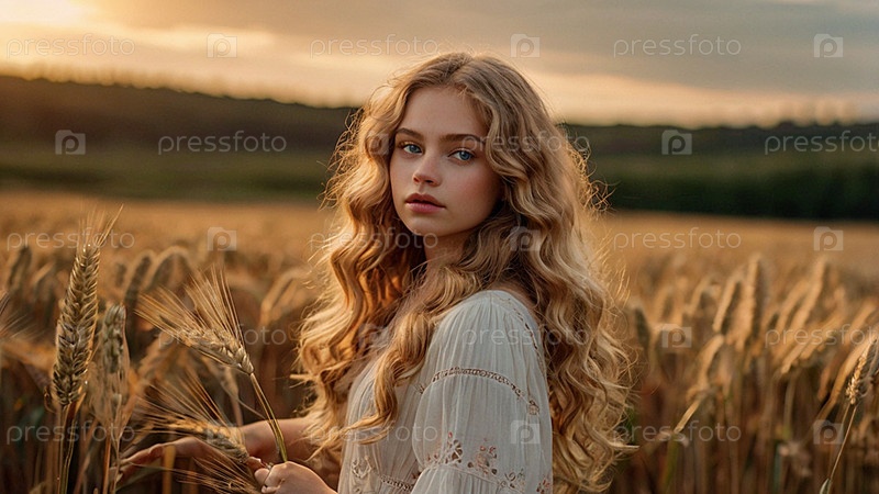 Теплый портрет красивой кудрявой женщины на пшеничном поле на закате. Романтическая, спокойная и чувственная фотография девушки в нежном платье