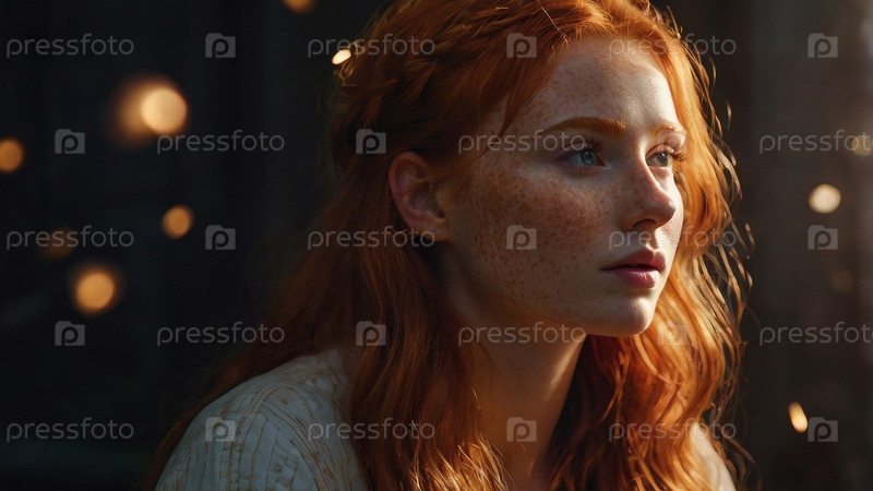 Портрет красивой рыжеволосой девушки с вьющимися волосами и веснушками на лице при солнечном свете