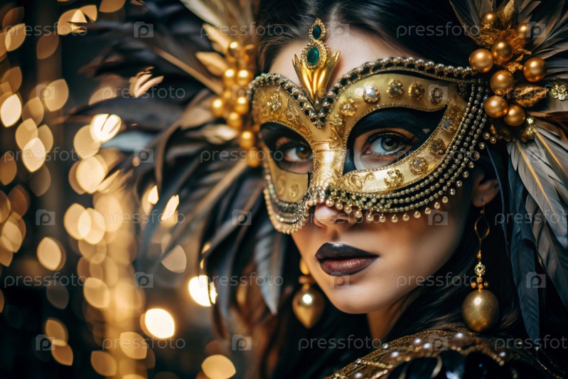 Венецианский карнавал. Закрытие женщины в богато украшенной карнавальной маске. Яркие цвета передают атмосферу праздника и роскоши