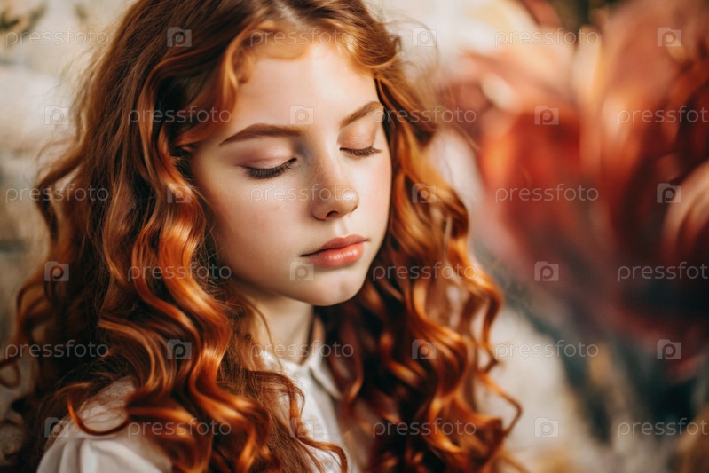 Портрет красивой маленькой рыжеволосой девушки с длинными волнистыми волосами и задумчивым взглядом. Волосы развиваются и создают ощущение легкости и естественности