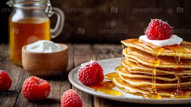 Вкусные блинчики с медом, черникой, малиной и . Концепция русского праздника Масленица
